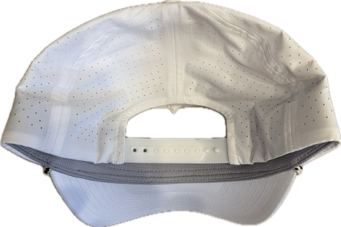 White rope style hat with a patch centered on the front of the hat. Patch is white, sewn on, featuring the Claiborne script logo.